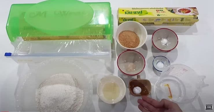 เริ่มด้วยการทำแป้ง ใส่ส่วนผสมทุกอย่างลงไป ยกเว้นน้ำมันพืช ที่เราจะใส่ในตอนท้ายของการผสมแป้ง ค่อยๆ เติมน้ำเปล่าเล็กน้อย จากนั้นคนเพื่อให้แป้งเข้าเนื้อกัน และทำการใส่น้ำมันพืชลงไปพร้อมนวดแป้งให้เกาะตัวติดกัน เมื่อนวดแป้งจนได้ที่ ให้แรปด้วยพลาสติกถนอมอาหาร เอ็ม แรป เพื่อป้องกันสิ่งสกปรก และพักทิ้งไว้ 4 ชั่วโมง