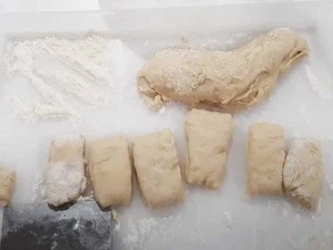เมื่อพักแป้งไว้ 4 ชั่วโมง ทำการแบ่งแป้ง เป็นส่วนๆ โดยให้หนาประมาณ 1 ซม. เพื่อเตรียมทอดลงน้ำมัน