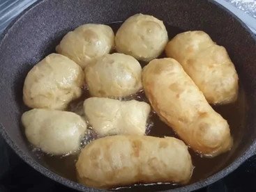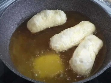 เตรียมน้ำมันให้ท่วม โดยใช้น้ำมันปาล์มในการทอด เพื่อช่วยให้แป้งกรอบมากขึ้น