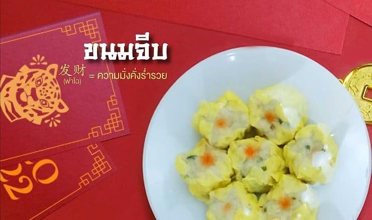 ขนมจีบหรือเกี๊ยวมีลักษณะคล้ายเงินตำลึงจีนสมัยโบราณ จึงเปรียบเหมือนความมั่งคั่งร่ำรวย